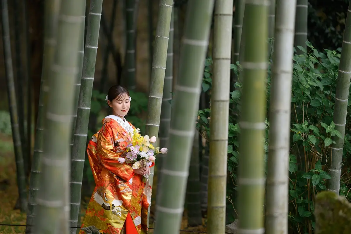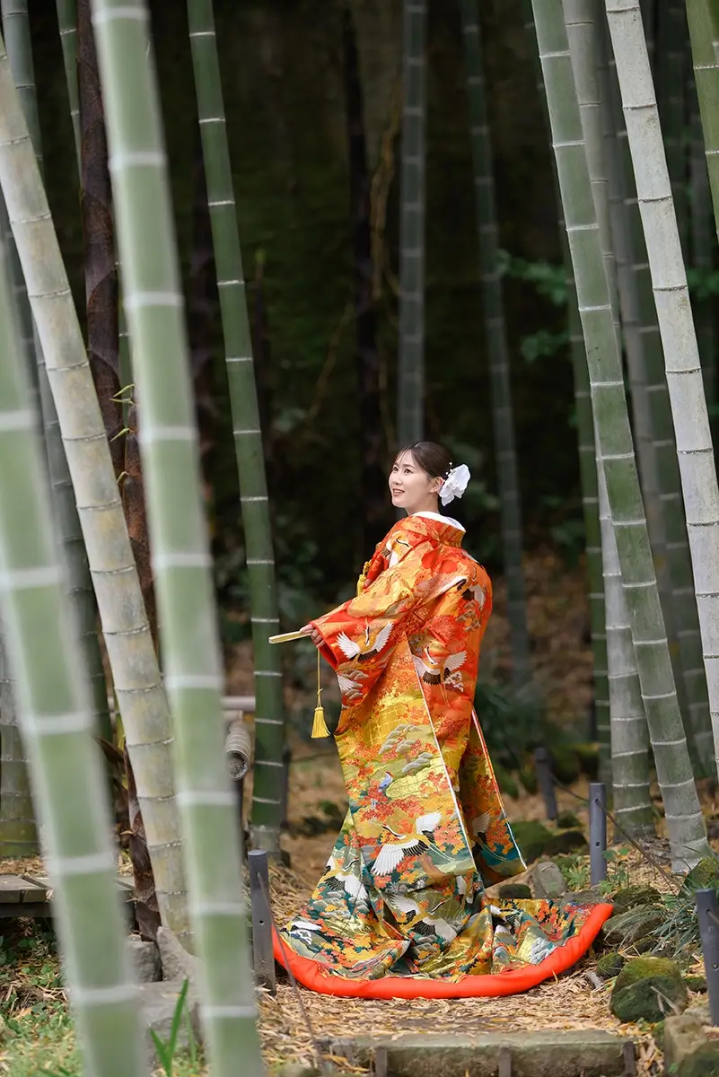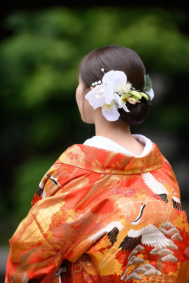 2023年12月22日 | 色打掛横浜 赤30 AKA30 深まる秋の趣ある色打掛 裾に向かって緑が深まり、紅葉が浮き出るような印象。山にむかって鶴が舞う柄。秋が濃くなる様子が描かれ、紅葉の季節に合わせたい一着。 SlideSlide BACK