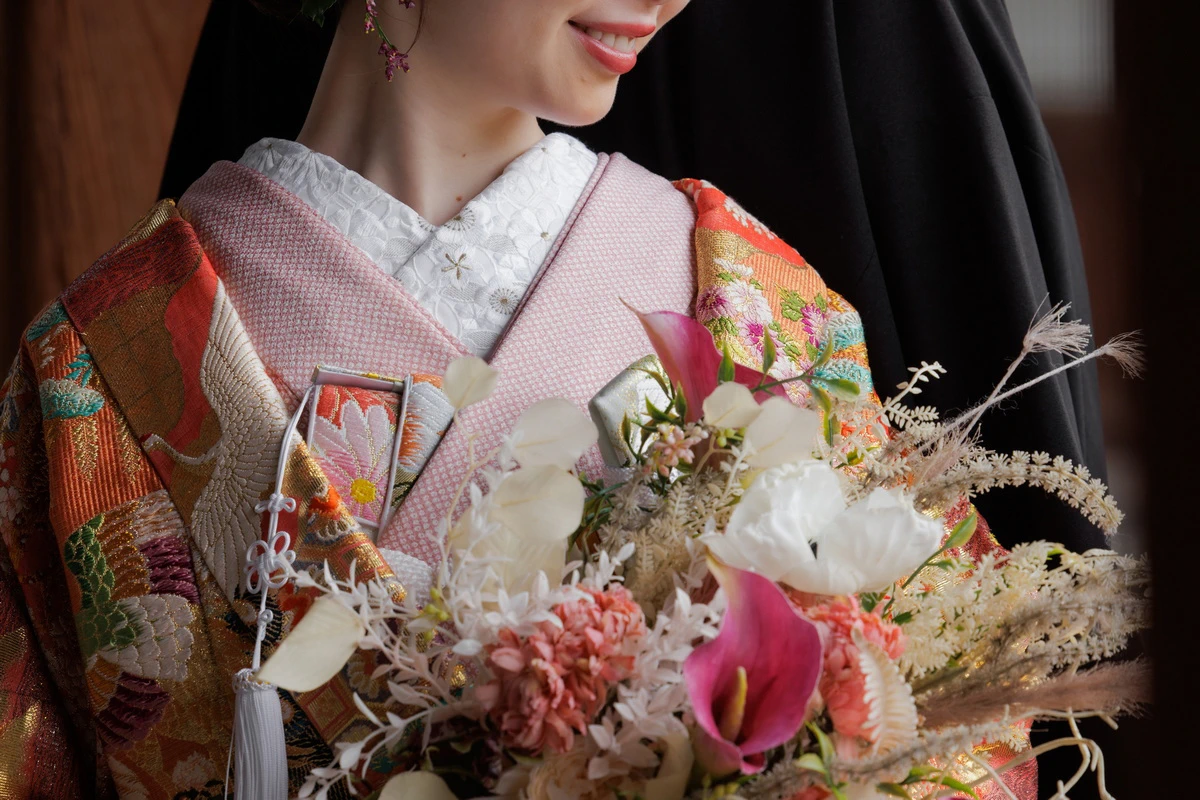 2)人気の色掛下コーディネートとブーケ付きで今どきの撮影に