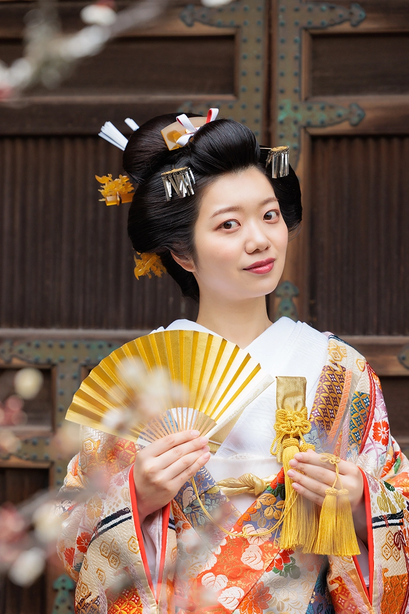 地毛結いの『文金高島田』は、かつらとは異なり、髪質や生え方に合わせて丁寧に結い上げる為、自然な立体感と美しさが生まれます。
