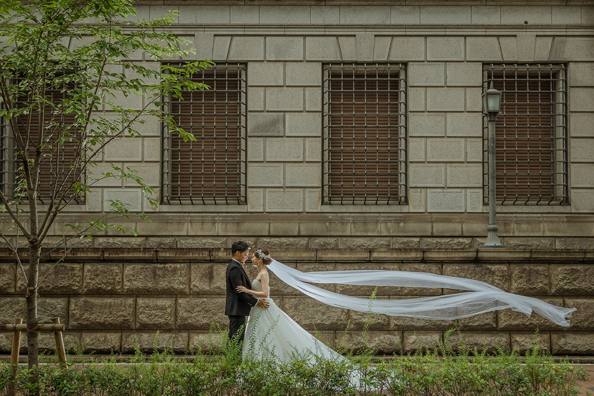 早朝の日本橋でドレス撮影 なびくベールが印象的